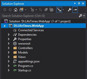 • Singleton: This lifetime creates one instance of the service. The service instance may be created at the registration time by using the Add()/AddSingleton() method