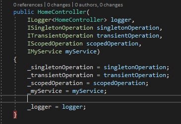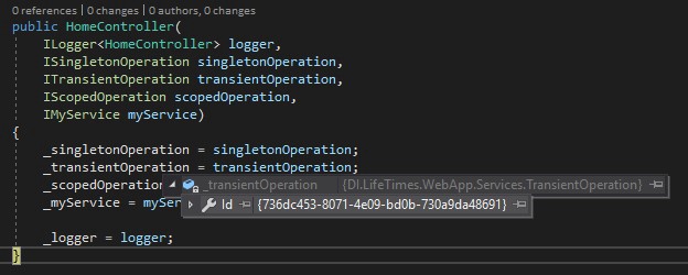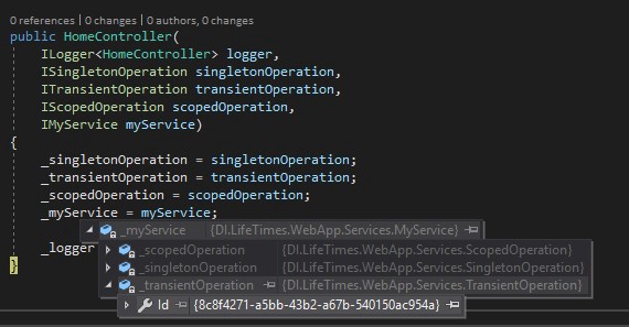 Before we check every object in the constructor you should remember each of the DI lifetime’s definition and try and apply it for this example.