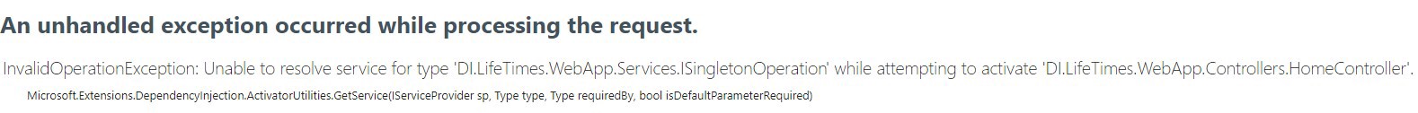 “InvalidOperationException: Unable to resolve service for type ‘DI.LifeTimes.WebApp.Services.ISingletonOperation’ while attempting to activate ‘DI.LifeTimes.WebApp.Controllers.HomeController’.”