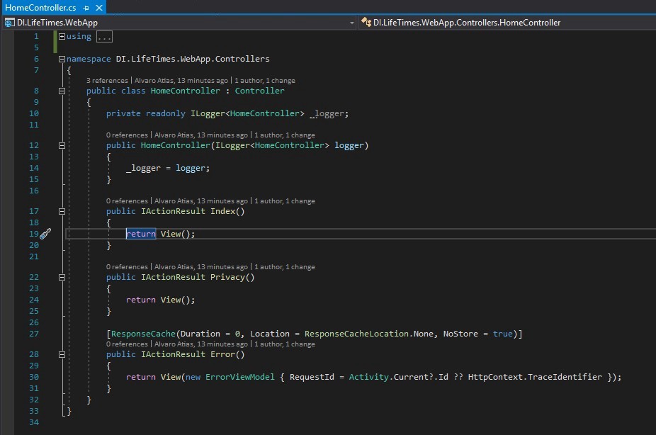 Before you relaunch the web application just set a breakpoint at the end of HomeController’s constructor: